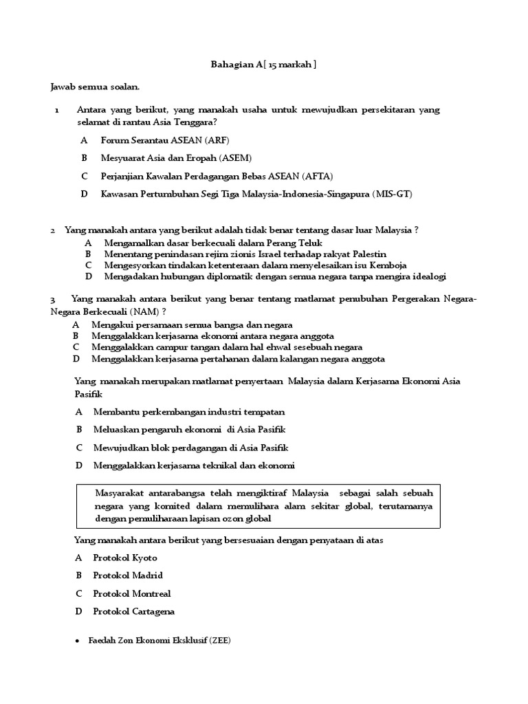 III Perubahan persekitaran antarabangsa yang mencabar IV Ketidakstabilan politik di beberapa buah Negara ASEAN A I dan II B I dan III C II dan IV D III dan IV STPM U3 2013 28. Warga Jepun Kanada Malaysia dan Indonesia bekerja dengan cemerlang anggota bomba kita ke Indonesia untuk membantu memadamkan kebakaran. Dasar luar sesebuah negara dibentuk dengan tujuan mempertahan dan mempromosi kepentingan keselamatan ekonomi dan lain-lain kepentingan utama negara.